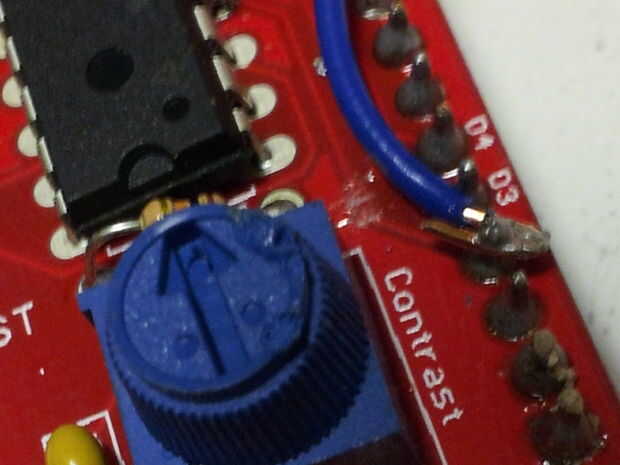 • Cortar el rastro que conecta el perno etiquetado "D2" de la cabecera de LCD a eso perno en el chip que simplemente soldar un cable a. Una vez más, ver las fotos.