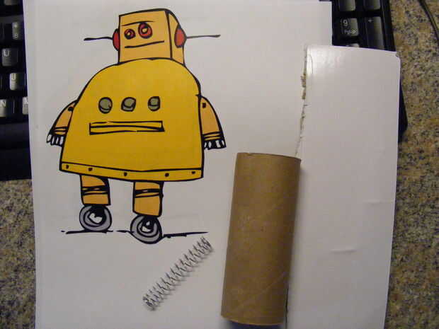 Cavar una vez más, a través del papel contenedor para encontrar un tubo de papel higiénico gastado, algunos desechos de cartón y una carpeta de archivo de manila, también necesita un pequeño muelle y un pedazo corto de alambre con aislamiento negro. Los resortes extraídos de un bolígrafo parecen un poco demasiado pequeños (es mi primavera 7/16 "x 2-1/8"). Pegamento artesanal, poco de cinta y un par de tijeras para armar,