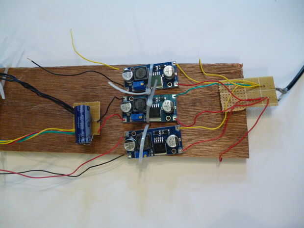 Una vez ajustado, desconecte el suministro de energía. Soldar cables a los terminales positivos de salida de los convertidores buck usados para alimentar las bombas, dejando los terminales negativos para más tarde. Para mí este fue el 6 y 12 voltios buck los convertidores. La duración variará dependiendo de cómo desea colocar la electrónica, pero 6-12 pulgadas (15-30 cm) debe ser buenos. Estos cables se unirá a los terminales de tornillo neutral en la placa de relé. Hacer cualesquier relés que se se cambio la misma tensión adyacente unos a otros y encadenar sus terminales neutro juntos. Asegúrese de que el cable puede soportar la corriente a que se someterán. Los relés y bombas se conectarán más tarde en el paso de la Asamblea .