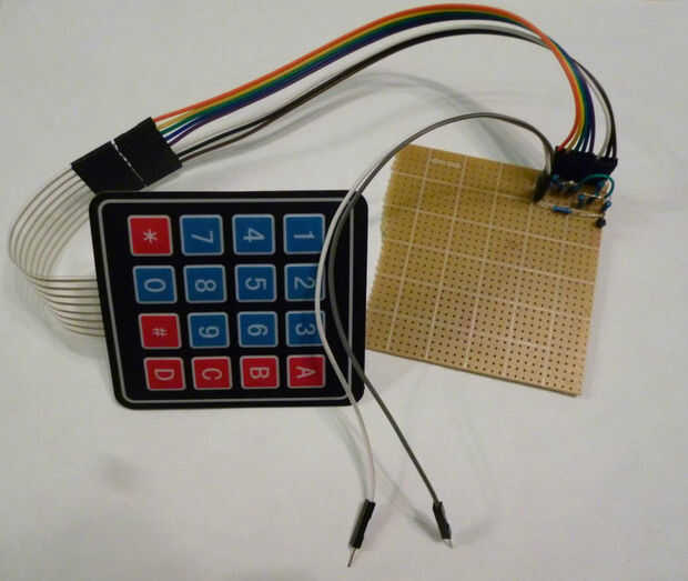 El circuito es esencialmente una matriz de divisor de tensión. Las obras del circuito es que la señal recorrerá diferentes resistencias dependiendo de la tecla. Esta señal analógica se pasa a través de la función getKeypad() en el código que determina qué botón se presionó. El circuito se muestra en la placa en el primer cuadro, así como en el enlace de arriba. Construir el circuito en un protoboard primero y luego probar.