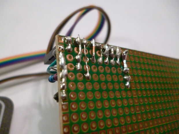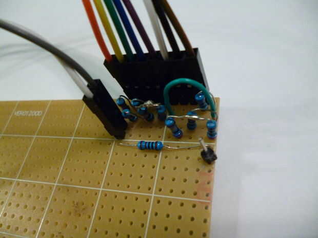 Para construir el circuito en la PCB me pareció más fácil montar las resistencias verticalmente. Esto ocupa menos espacio. Para puentear las conexiones en la parte inferior de la PCB, el plomo de la resistencia a su destino final de la soldadura y cortar lo que queda. Entonces puede soldar los puntos de conexión que necesita a lo largo de la longitud del cable.