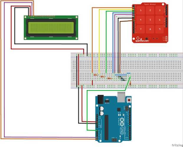 La pantalla LCD con la mochila de I2C tendrá cuatro pernos, + 5V, GND, SDA y SDL como se muestra en la imagen. SDA y SDL están conectados a los pines A4 y A5, respectivamente, como se muestra en el diagrama de cableado. Es preferible conectar el GND y pines VCC directamente al convertidor buck 5 voltios, sin embargo conectar a la alimentación de Arduino deberían funcionar así. Tenga en cuenta que un LCD sin la mochila de I2C fue utilizado en el diagrama como ninguno con I2C estaban disponible en el programa, Frtizing. En la parte posterior de la pantalla habrá un bote de ajuste que se puede utilizar para ajustar el contraste de la pantalla.