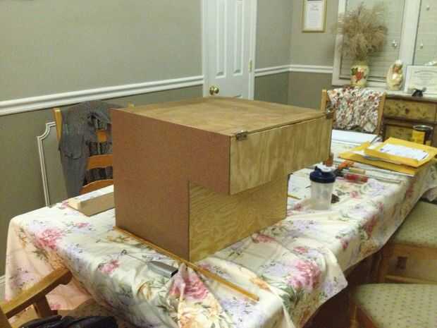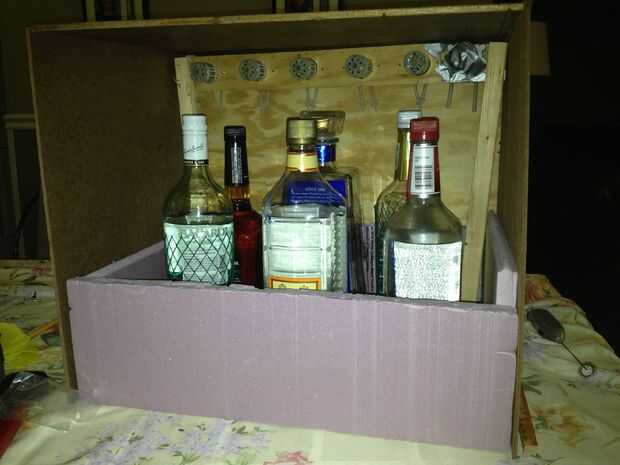Hice el recinto, visto en las fotos, de madera de repuesto que tenía. Puede utilizar cualquier madera desea y modificar el gabinete para satisfacer sus necesidades. Planos para construir un recinto más o menos idéntico se unen en forma PDF. Toda la madera utilizada es madera contrachapada de 1/4". El compartimento principal tiene las botellas y el más pequeño tiene la electrónica y es donde las bebidas se distribuirá desde. Usted puede asegurar a éstos junto con tornillos, clavos, clavos del clavito o pegamento.