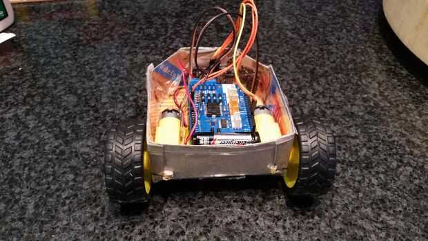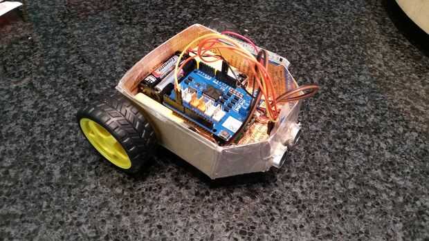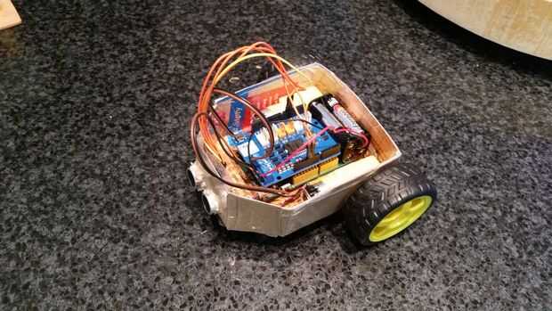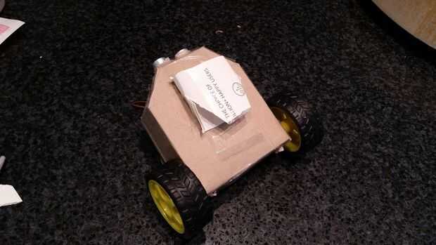 así que decidí construir mi propio chasis. El pensamiento 1 º fue hacer de madera de corte láser, pero mis hijos querían jugar con el robot mismo día y todo lo que tuvimos en mano era una caja de cereal de cartón y unas tijeras. Así que me fui a trabajar.