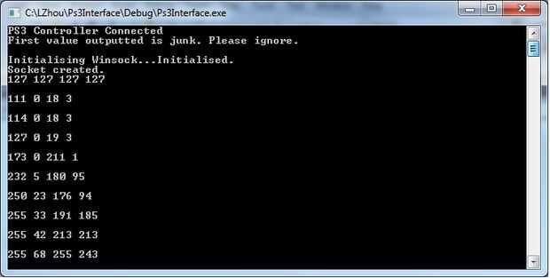 Abra el archivo PS3Interface.sln en Microsoft Visual Studio y haga clic en el botón de play verde (Start debugging). Ejecute el software para comprobar el funcionamiento de la controladora y el wifi. Cuando se ejecuta el código, verá una ventana de comandos con cuatro valores de actualización constante (véase el cuadro arriba). Estos valores son los valores X e Y para el stick analógico derecho e izquierdo respectivamente.