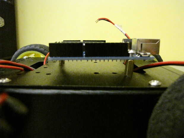 Dos de los tornillos y conectar el Arduino a los separadores. Luego la pila el escudo de Wifi en la parte superior el Arduino.