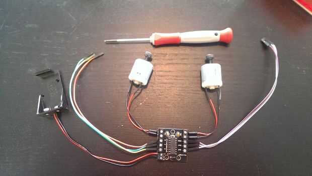 Puede alambre los motores, soporte de la batería y los cables para el L293D pcb como se muestra. La batería de 9V potencia independientemente los motores. Los motores ellos mismos se unen a los terminales marcados "MA" y "MB" en el tablero que tengo.