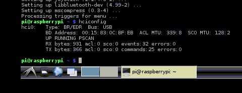 Después de ejecutar este script debemos comprobar si el IPC es viendo el dongle de bluetooth. Ejecute "hciconfig" en el símbolo del sistema. Esto le dará una salida de la misma como la imagen de arriba si eres bluetooth dongle se ha colocado antes de arrancar. (Si no, puede que necesite reiniciar)