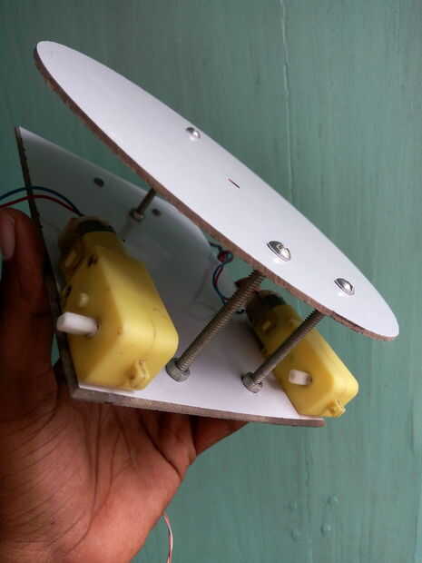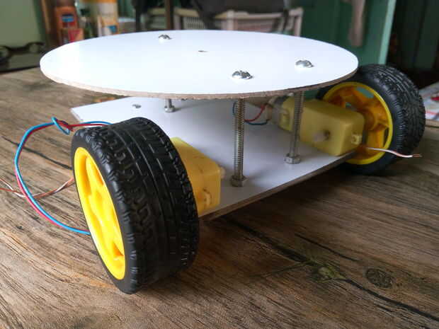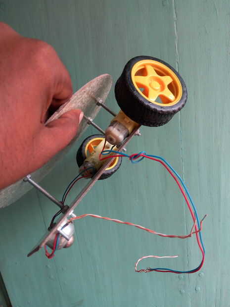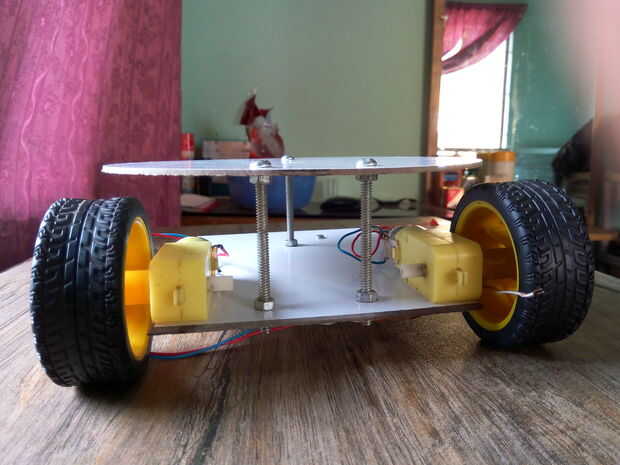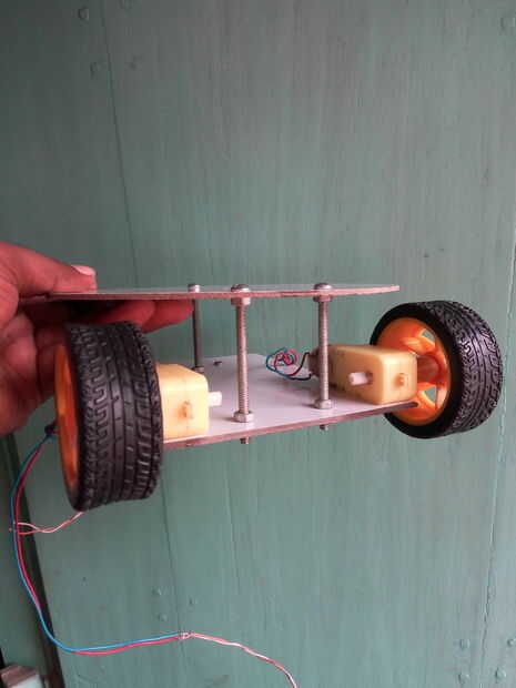 Utilizando 3 pulgadas tuercas fijan tablero dos juntos como como figura. Las tuercas pueden ser más pequeños entonces 3 pulgadas o más grande de 3 pulgadas, depende de sus requisitos y elección. Use pegamento de cena para conectar dos motorreductor a tablero inferior. Después de conectar dos tablas y el motor, conectar la rueda al eje del motor. Su chasis está listo!