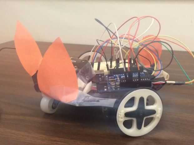 Esto es un robot que pone en marcha con una palmada y hacia atrás con dos y a sólo ir hacia atrás si aplaudir dos veces mientras su ir hacia adelante y viceversa. Yo quería hacer este un poco más divertido, así hizo bunny-themed.