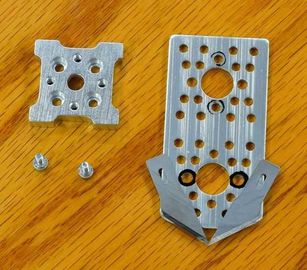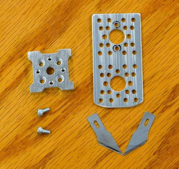 Posición dos #24 X-ACTO® (o similar) las hojas, como se muestra en la segunda imagen y abrazadera en lugar con un montaje de eje. Los tornillos vienen detrás del soporte del canal. Mantener el acabado monta hasta el carro y verificar que las cuchillas se extiendan hacia abajo en la ranura de corte. Ajústelas según sea necesario. Tenga cuidado: Estas cuchillas son afiladas!