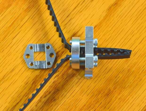 Corte una sección de 40" de correa, alimentar alrededor de la polea y alimentar los extremos a través del 1/4" espaciador de cubo y cubo de montaje como se muestra en la primera foto.