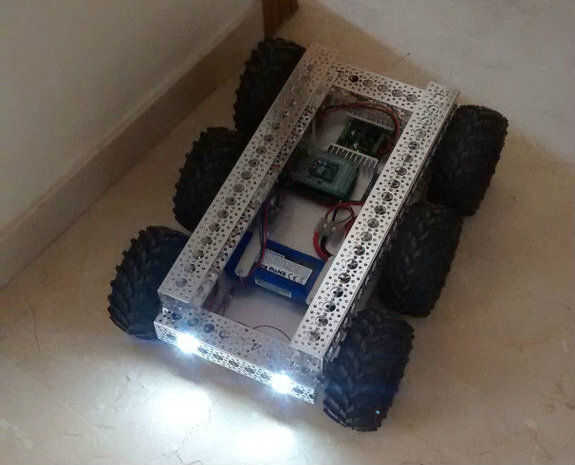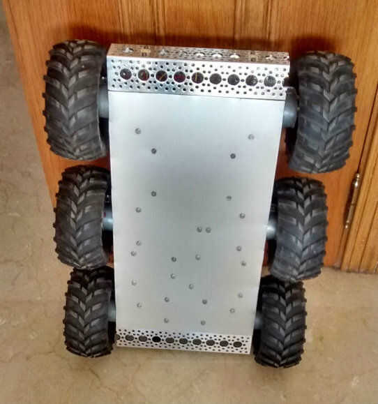 El robot es un resistente y fácil construir chasis de canales de aluminio "Actobotics". Gracias a estos canales podemos obtener una gran robustez y un peso reducido. Elegir seis ruedas con seis motores que les dan una gran tracción. El movimiento es realizado por dos grupos de tres motores. Los tres motores en cada grupo se mueven al mismo tiempo. Un grupo en el lado derecho y otro en el lado izquierdo. Dan el robot un tanque como el movimiento que simplifica considerablemente la tracción.