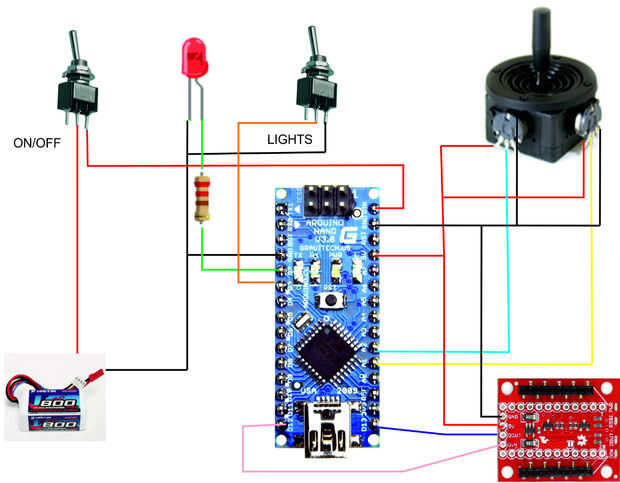 Pues es bastante sencillo y puede hacerse de muchas maneras. Os dejo un dibujo con todo el cableado necesario, así como el código que utilizan para programar el Arduino Nano.