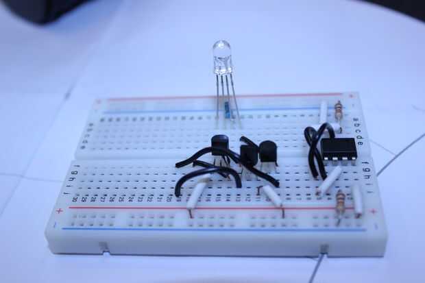 Ahora que el LED está conectado con seguridad, podemos empezar a añadir los interruptores de transistor para alimentar los cables y sensores. Desde el comparador compara dos voltajes, no debe preocuparse por el número de fuentes que conectar los transistores. Inserte un transistor con E en el g12, B en g11 y C en g10. Conectar la clavija E a tensión. C Conecte el transistor para el cable rojo del LED y h18. Luego, con puentes, conecte B al pin 8 en el Arduino. Inserte el segundo transistor con E en h12, h13 B y C en h14. Conecte C la verde en el LED y h19. Volver a usar puentes, conectar B al pin 9 en el Arduino. Introducir el tercer transistor con E h17, B en h16 y C en h15. Conectar E voltaje y B al pin 12 en el Arduino, una vez más, mediante puentes. Por último, conecte C para el cable azul de la RGB y h120.