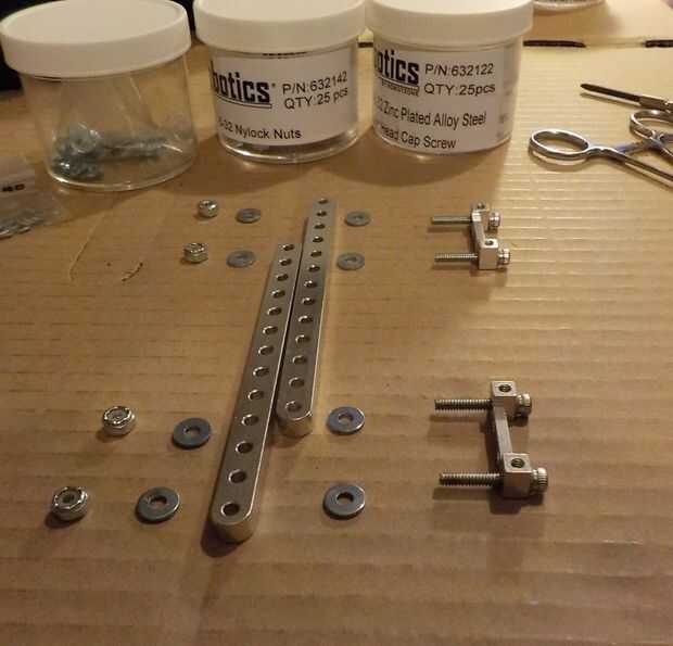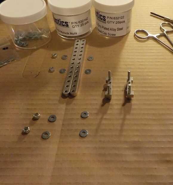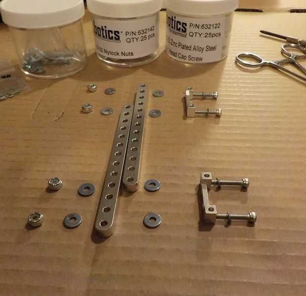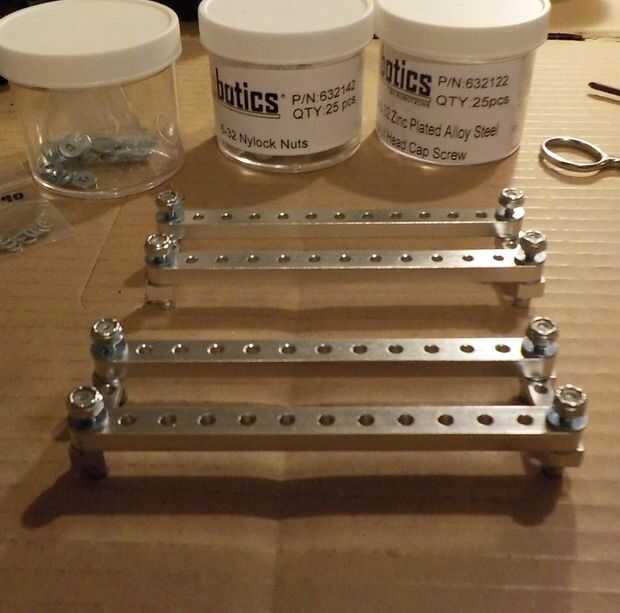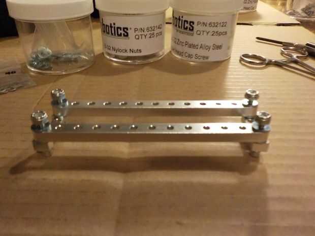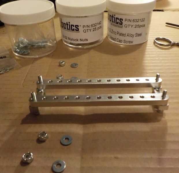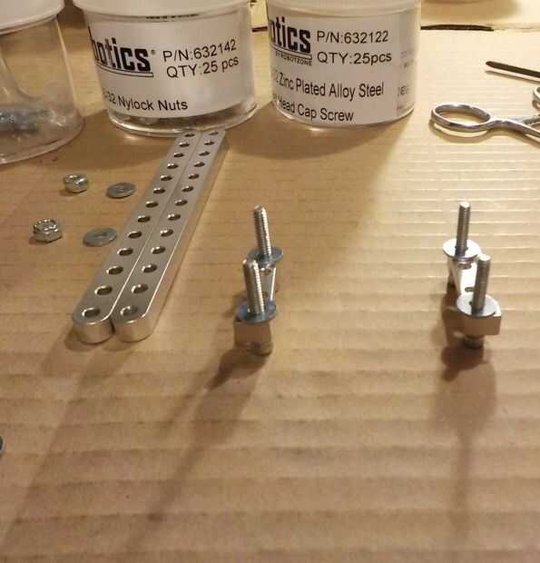 Coloque las vigas de aluminio sobre los tornillos vertical. Coloque una arandela estándar #6 y una tuerca Nylock en cada tornillo, con la mano es aceptable en este punto.