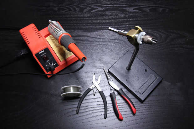 Herramientas necesarias son cortadores de alambre y strippers, Cautín, alicates, pegamento y un tornillo de banco. Me gusta usar una prensa de atado, porque está diseñado para sostener objetos pequeños y fácilmente gira sobre un eje.