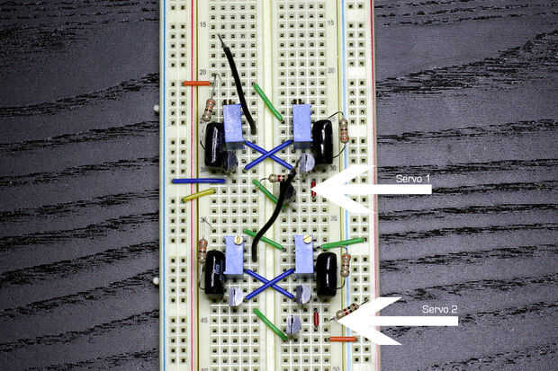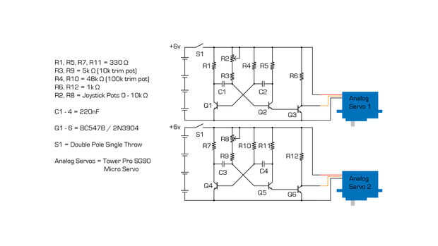 Usted puede encontrar muchos ejemplos en línea de control de servos con Arduino o incluso un chip 555 temporizador, pero voy a conseguir realmente fundamentos aquí y usar componentes sólo discretos. Vamos a usar el circuito del multivibrador Astable. Sólo una advertencia, este circuito suele ser... nerviosos, y sus servos ganará mucho de la personalidad.