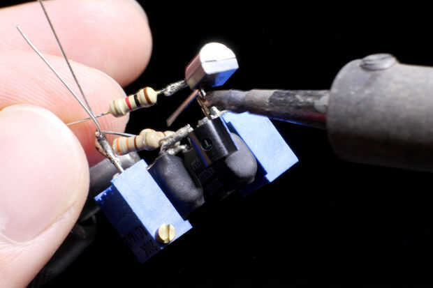 Soldar los dos extremos abiertos de las resistencias Ω 330 para el extremo abierto de la maceta adorno de 100 k. Este es nuestro carril de voltaje positivo.