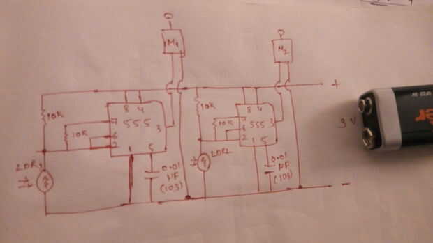 el circuito es dejar de fumar fácil y todo lo que tienes que hacer es fijar todos los componentes según circuito. mejor si pones las LDRs separado para que sea fácil de colocar.