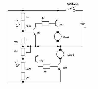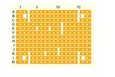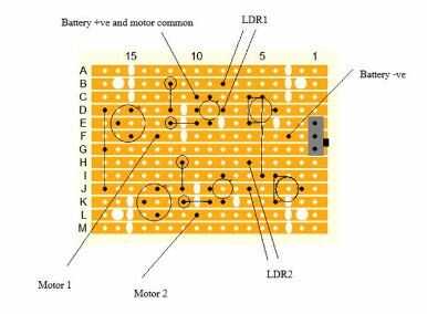 El robot está construido sobre un pequeño trozo de 0.1 en matriz perforada 13 tiras por 17 agujeros. Algunas de las tiras necesitan tener roturas en ellos como se muestra en el diagrama. Estos saltos se realizan con un taladro de torcedura, estos saltos se hacen ya para, el interruptor es también soldado en la placa.