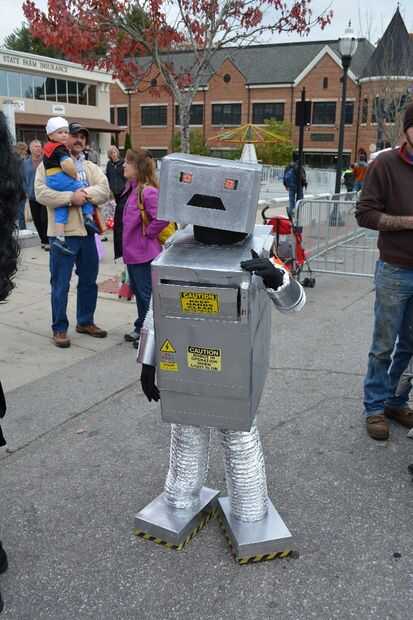 Este traje de robot que me llevo unas 4 semanas para hacer, la mayoría de las veces se suelda y programación y prueba el código del microcontrolador. Este traje tiene 4 microcontroladores (2 en la cabeza y 2 en el cuerpo). En la cabeza, un Arduino Nano es controlar los LEDs activado por voz y un mbed para Nucleo controla los ojos que se hacen de dos MAX7219s. Programé el nano y el mbed para utilizando C++. En el cuerpo, un Arduino Nano está controlando los 14 LEDs que parpadean aleatoriamente (dos a cada lado del cuerpo y 12 en una matriz en la parte delantera parece computadora lecturas de viejas películas), y un LinkIt uno de los laboratorios de Mediatek utiliza un escudo de arboleda para controlar el LED y el LED Bar junto a la gaveta de caramelo , el servo que abre y cierra el cajón de los dulces, el botón sensible al tacto para controlar el servo y se reproduce sonido desde un altavoz en el lado del cuerpo. Tuve que usar guantes especiales que se utilizan para enviar mensajes de texto en teléfonos de pantalla táctil para poder activar el cajón de caramelo utilizando el botón sensible al tacto. Los ojos mirar a la izquierda, derecha y adelante y parpadean. Los brazos están hechos de aluminio calefacción conductos así como plásticos baldes de pintura con el fondo cortan y pintaron plata. Las piernas están hechas de aluminio calefacción conductos y dos cajas de cartón. La cabeza y el cuerpo están hechos de tres cajas de cartón pintado plata. La boca del robot se cubre con un nylon para que puedo ver a través de él, pero se ve negro (cuando no estoy hablando) me puse este traje para mi fiesta de Halloween y vino local en segundo lugar, y entonces me puse en truco o trato sin las piernas (porque era imposible subir y bajar escaleras usarlos)