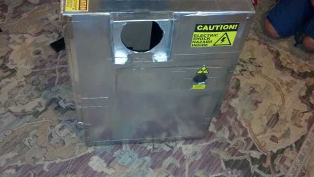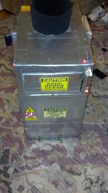 Tengo puesto dos cajas juntas para hacer un cuerpo que era lo suficientemente grande como para que me lleve, casa de la electrónica y un cajón de caramelo. Inicialmente lo pegado con cinta aislante, pintada plata, añade pegatinas y alguna cinta así. Los indicadores de cajón Grove Bar y caramelo (LEDs) tuvieron que ser grabado en el cuerpo con cinta metálica que parecía mejor. La arboleda toque sensor puse en la parte superior del cuerpo para que yo pudiera llegar con mi dedo. El orador tuvo que ser montado con cinta dentro del cuerpo por lo que podrían reproducir sonidos al abrir y cerrar el cajón.