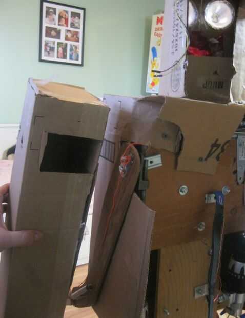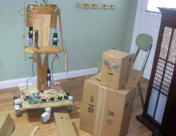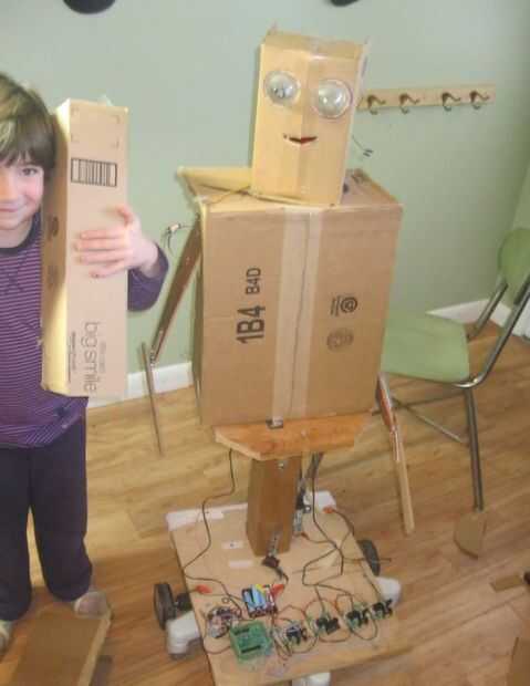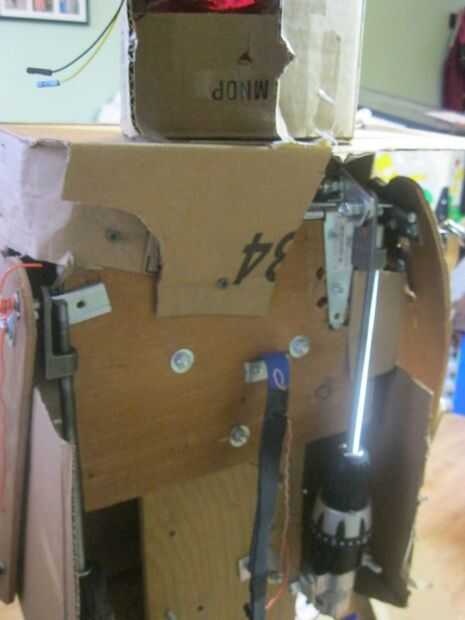 parte principal de este robot es cartón. El dorso es de cartón, la parte delantera, y por lo tanto es la parte inferior sosteniendo lo. Se puede mueve su cabeza y sus brazos. Para hacer este robot, usan una caja de zapatos de cartón, pegamento calien