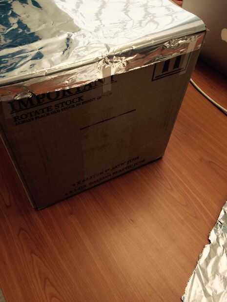 hice 12 robot "kits" para mis hijas bday party.Para hacer uno, usted necesitará:2 cajas (uno más pequeño que el otro), hojas de papel de aluminio, adhesivo en aerosol, cuchillo xacto, cinta del conducto (plata y rojo), conductos de servicio de l