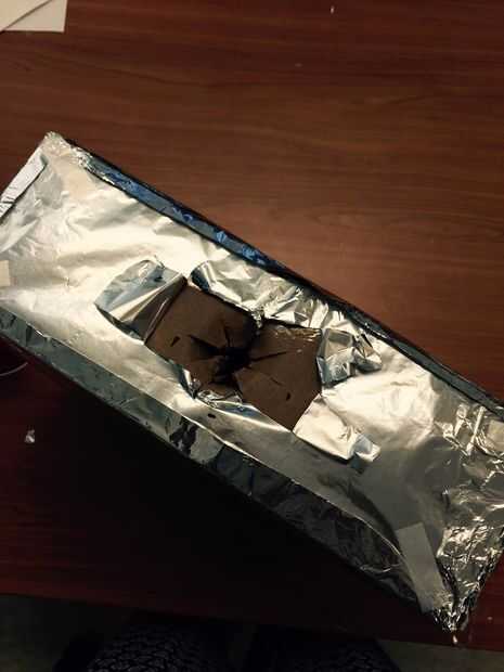 hice 12 robot "kits" para mis hijas bday party.Para hacer uno, usted necesitará:2 cajas (uno más pequeño que el otro), hojas de papel de aluminio, adhesivo en aerosol, cuchillo xacto, cinta del conducto (plata y rojo), conductos de servicio de l