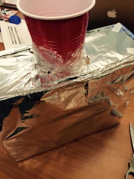 Una vez que usted decida dónde debe estar el cuello, marque el punto y empezar a cortar. Hice el agujero más pequeño que la Copa solo y aplastado la taza un poco para conseguirlo en el agujero. Esto hace que el cuello un poco más seguro. Una vez que la copa en el orificio utilice la cinta de embalaje para asegurarlo en su lugar.