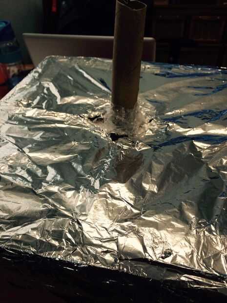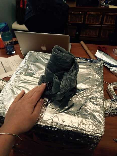 En la parte superior de su cuerpo de robot en el centro de despegue un pedazo pequeño de papel de aluminio.
