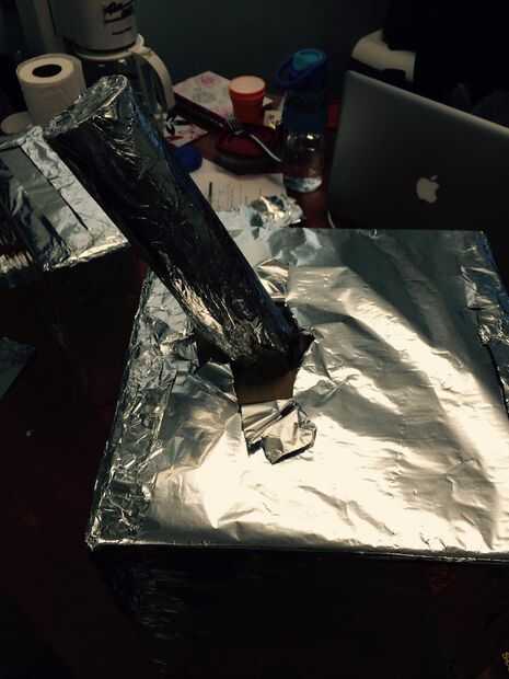 hice 12 robot "kits" para mis hijas bday party.Para hacer uno, usted necesitará:2 cajas (uno más pequeño que el otro), hojas de papel de aluminio, adhesivo en aerosol, cuchillo xacto, cinta del conducto (plata y rojo), conductos de servicio de l