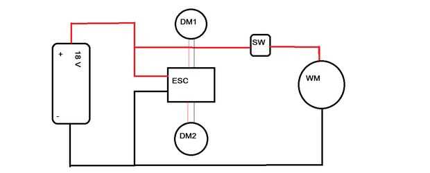 Los dos motores se conectan a la ESC al igual que la batería. No importa que cables del motor se conectan a las ranuras A y B. Si el motor gira la dirección equivocada, puede cambiar los cables o invertir el canal en la pantalla de configuración del transmisor.