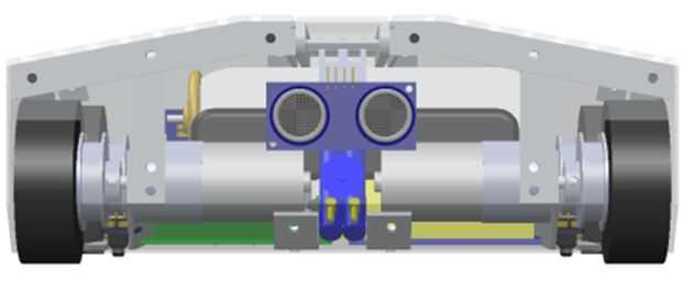 El posicionamiento de los componentes internos dentro del chasis se puede ver en el vídeo de arriba. Los motores se han colocado de forma que las ruedas sobresalgan hacia atrás pasando la parte trasera del robot, esto permite tracción continuo si se produce el montaje accidental de rampa de otro robot. Debido a la batería es el componente más pesado, que se ha colocado centralmente sobre la rueda base para dispersar su masa uniformemente y generar la máxima tracción.