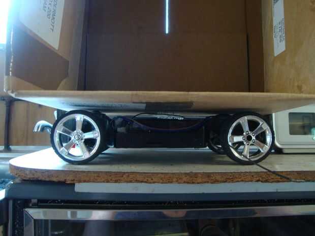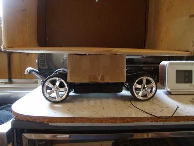 Ahora, el chasis y coloque la parte inferior de la caja con pegamento, Velcro o mucho y un montón de cinta adhesiva muy fuerte. Si las ruedas se frotan contra la caja, simplemente coloque una cajita plana al chasis y luego la fije a la caja principal por lo que es el espacio de la rueda.