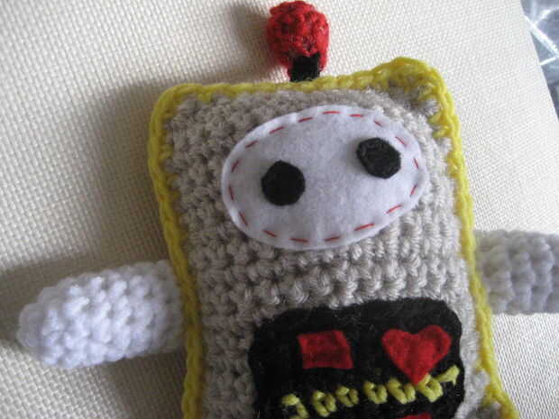 Todos hechos con hilo, relleno con relleno de poliéster, se enfrentan y detalles más pequeños fueron cortadas de fieltro y cosidos en su lugar.