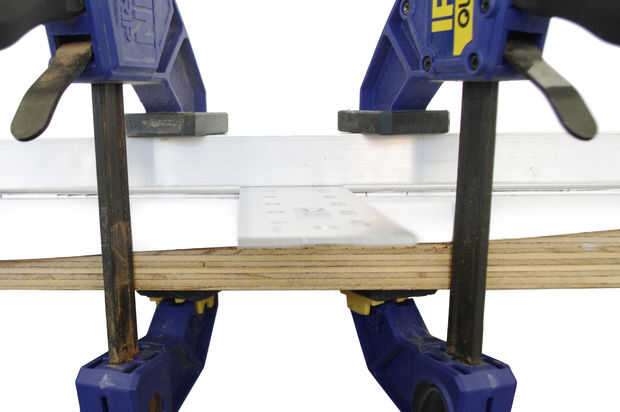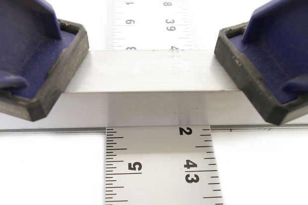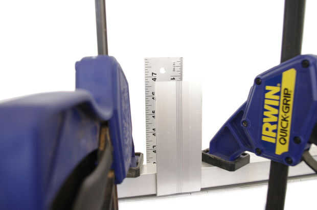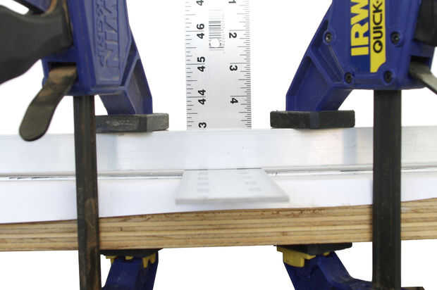 Usando un tornillo de mesa o dos barras de metal fijadas al borde de la mesa, hacer un grado 90 de la curva de la regla en 6" desde el borde que los agujeros fueron perforados.