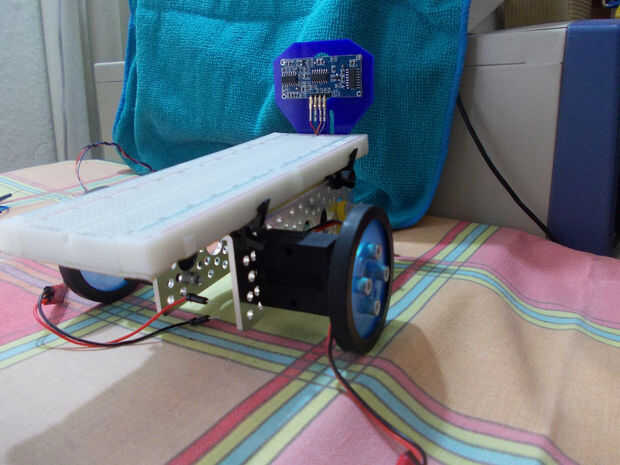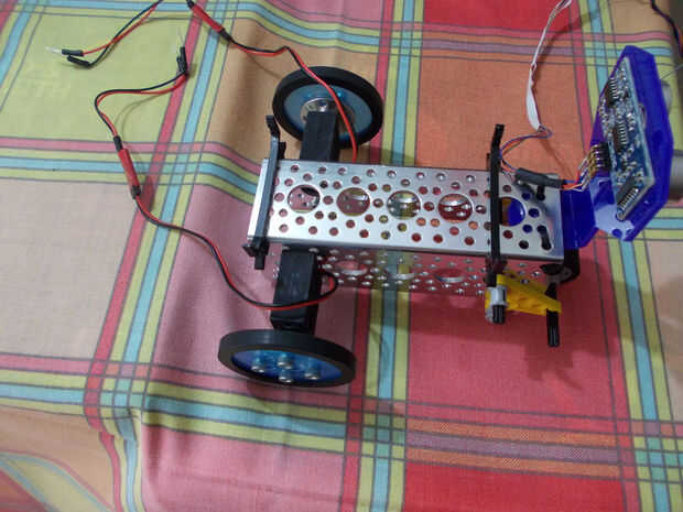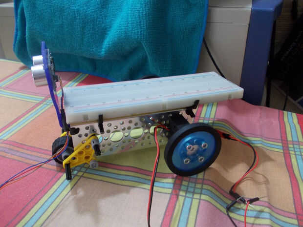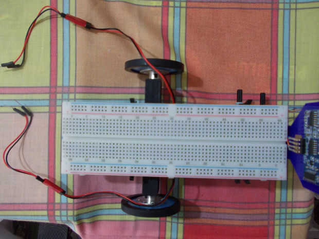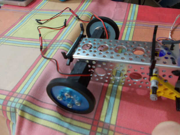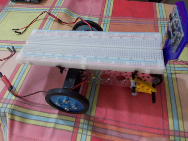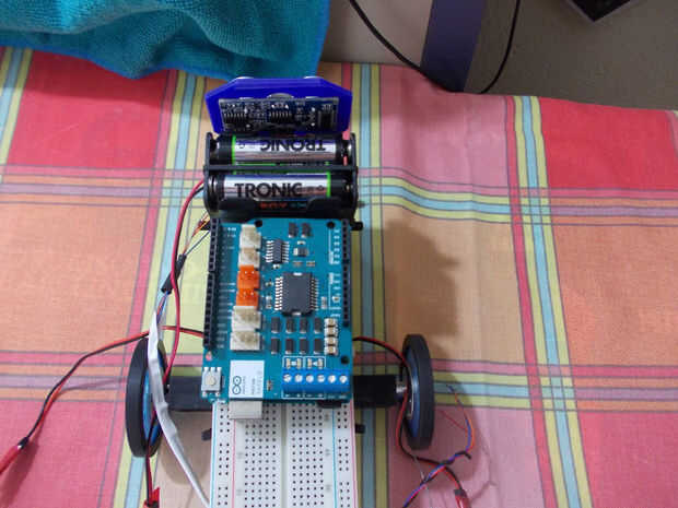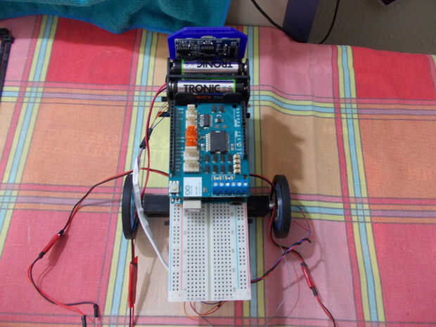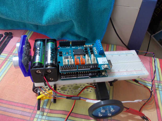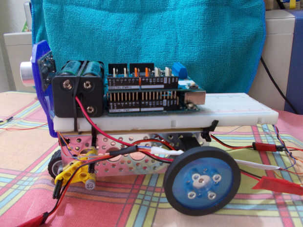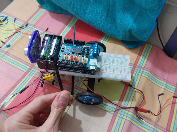 Siguiente paso debemos fijar los cables, conectar los motores al escudo, colocar una segunda batería de 9V y el sensor de alambre.