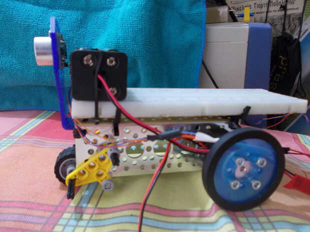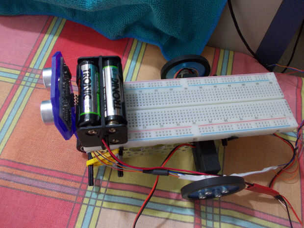 Fije la placa detrás del sensor ultrasónico Coloque la batería que se incluye en el kit y fijarla a la placa.
