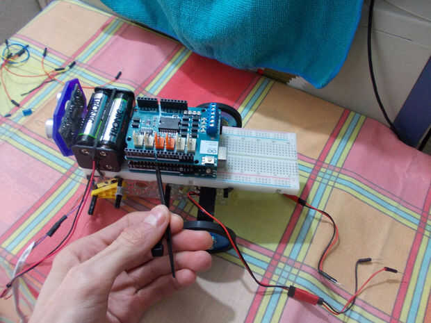 A continuación tomar la arduino uno y escudo del motor y con una lazo cremallera fijar a la placa.