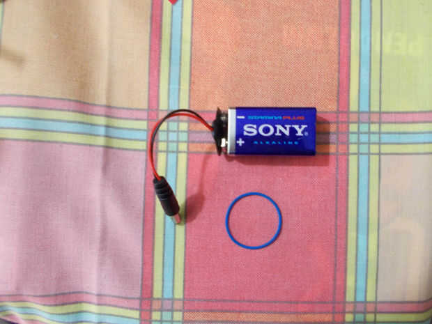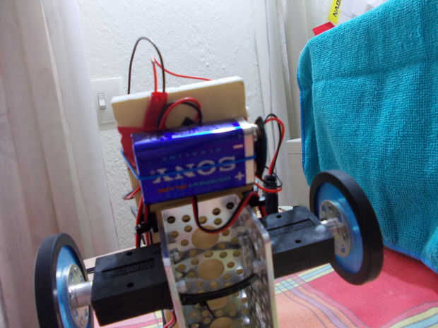 La batería de 9V también es importante porque queremos un arduino y un escudo de energía los motores. Así con el paquete de baterías 4AA y la batería de 9V que tenemos una buena solución. Coloque la batería de 9V en la parte posterior y por debajo de la placa.