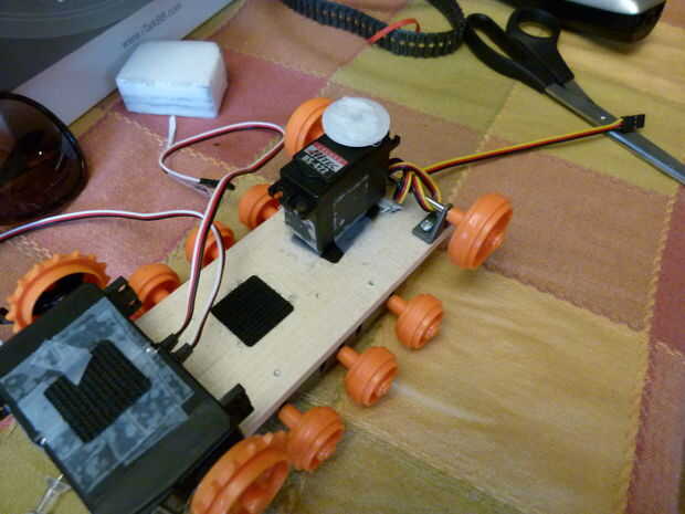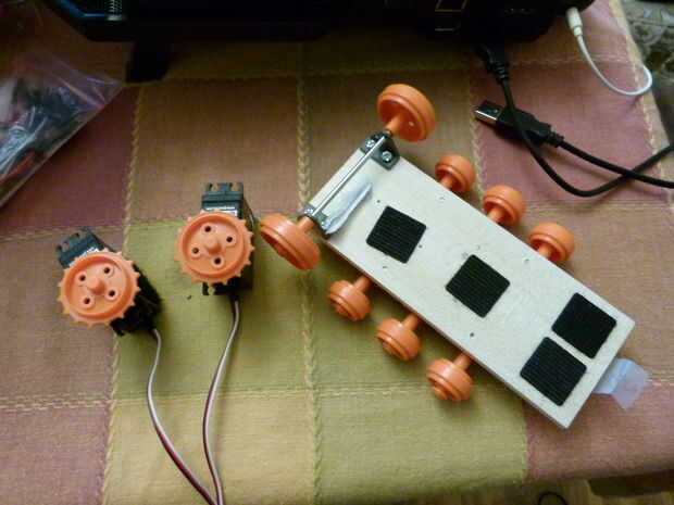 Esta es la parte! Usted ahora completando la sección de hardware de su proyecto. En primer lugar, tienes que montar el kit de Tamiya pista. Si usted quiere, puede montar todo el asunto, pero lo que realmente necesita para montar son las 2 pistas y el resto de las ruedas. Te darás cuenta que las ruedas con dientes no tienen un eje de movimiento libre, pero una caja de cambios en su lugar. No necesita montar o incluso utilizar la caja de cambios! Guardar las piezas para otros proyectos porque sólo necesitamos las 2 ruedas con dientes. En primer lugar, deberás cortar los signos más que viene con sus servos continuadas. Sólo corta la mitad, aprox. 2 agujeros del centro, lo suficiente como para encajar en las ruedas de Tamiya. Después de que termines haciendo a ambos servos (solo continua los), caliente pegar las ruedas de los servos. Ahora, coloque los servos con los fondos que se tocan, lados hacia abajo y la parte larga apuntando hacia fuera, o de lo contrario tu robot correrá hacia atrás. Luego conecte el servo (servo 180 grados) del sensor hacia arriba con el lado largo hacia atrás. Puede utilizar pegamento, velcro o cinta para sujetar los servos hasta la base (usé velcro, pero nada funciona). Ahora usando el protoboard, conecte los servos al puerto 5V y a una tierra común (GND). También conectar los servos a los pines de derecha digitales. Luego coloque la caja de la batería entre el continuo y 180 servos y pegar la placa encima de la caja de la batería.