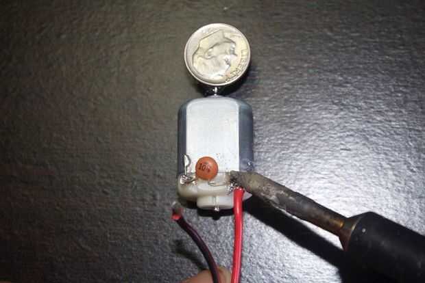 Soldar un cable en el lado derecho del motor. Asegúrese de que la punta metálica del cable toque el metal del motor.