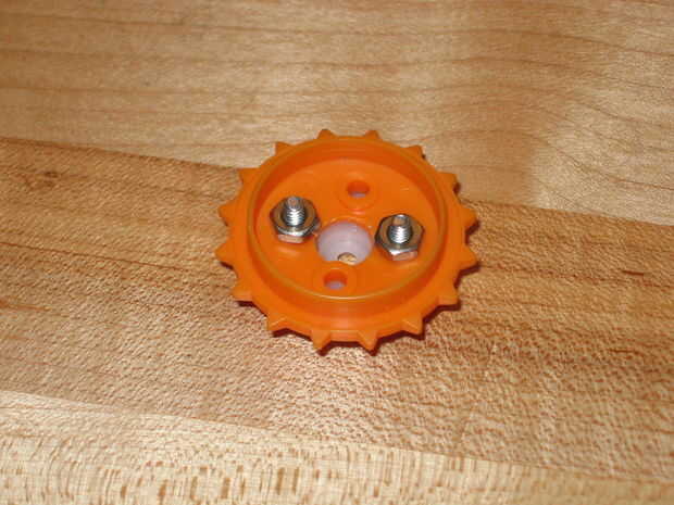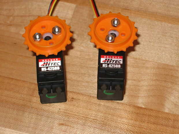 Quitar las ruedas servo. Coloque dos 4-40 x 1/2" tornillos de la parte posterior, a través de los orificios agrandados. Garantizar dos tuercas 4-40 en la parte delantera. Inserte dos tornillos que sobresalen por dos agujeros en el engranaje del accionamiento y asegúrela con dos tuercas 4-40 más. Vuelva a colocar la rueda del servo. Repita para el otro servo.