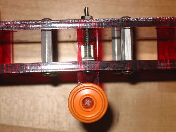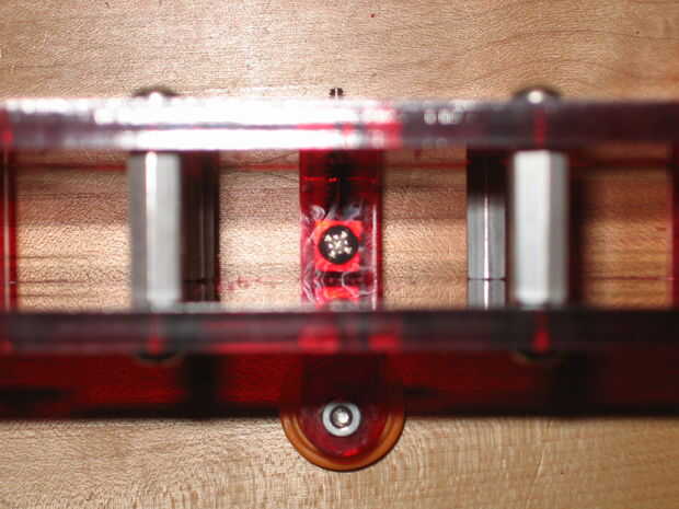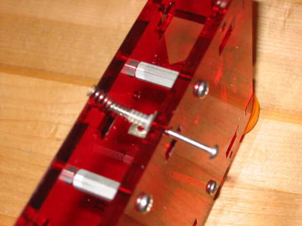 En cada uno de los seis agujeros a lo largo de los lados de las cubiertas, instale el perno de suspensión, soporte, collarín y primavera. Comience por introducir un 4-40 x 1 1/2 "perno hacia arriba a través de la cubierta inferior. Coloque el lado no aprovechado de una escuadra sobre el tornillo con el otro extremo apuntando hacia arriba. Coloque un collar de brida de plástico sobre el tornillo. Coloque un resorte sobre el collar. Con cuidado, presione el resorte debajo de la cubierta superior y alinee con el orificio superior. Pase el tornillo por el agujero y asegúrelo con una tuerca de 4-40. Coloque un puntal de la suspensión hacia arriba con la rueda hacia afuera. Alinee el orificio en el puntal con el agujero roscado en la escuadra. Asegure con un tornillo 6-32 x 5/16.