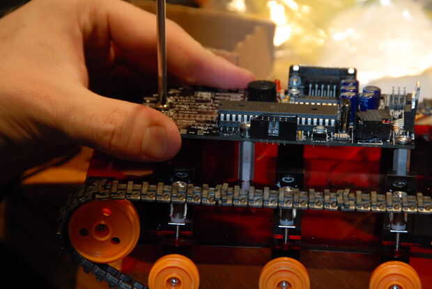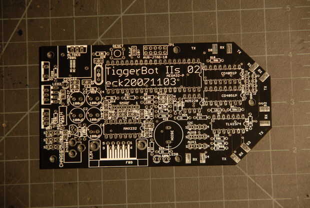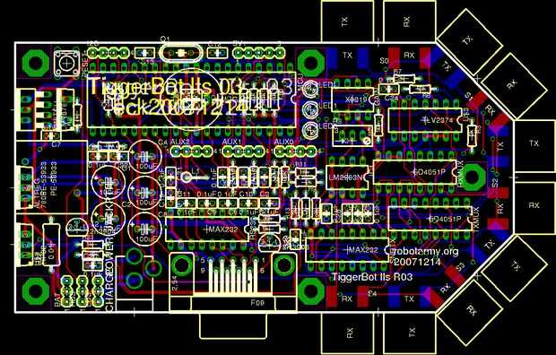 El circuito está diseñado con un microcontrolador avr, administración de energía y un sonar de cinco canal. Todo lo necesario para hacer cosas simples como la siguiente pared y evitación del obstáculo tiene. Está diseñado con componentes por-agujero por lo que no es especialmente difícil de soldar.