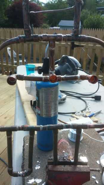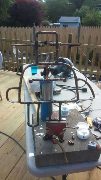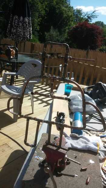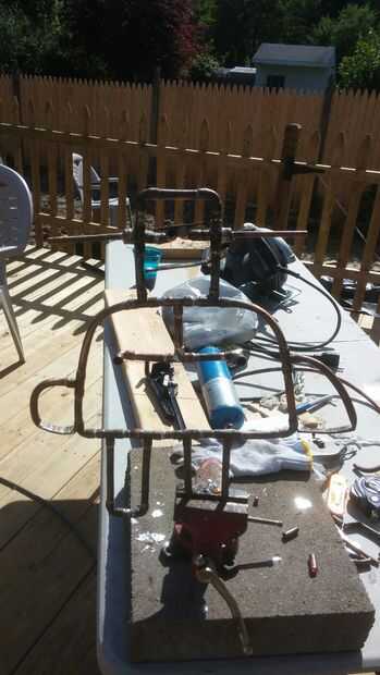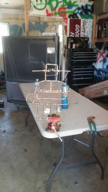 Realmente no sabía lo que quería hacer este paso. Pensé algunas maneras diferentes para hacer esto, pero ninguno de ellos parecía funcionaría, así que me di cuenta de que no se verían a terrible. Lo que hice aquí fue cortado en una t en el medio del cuello. Me encontré un trozo corto de tubo hasta una camiseta. Corrí dos piezas cortas de ambos extremos de la t, a dos de los años 90 hacia fuera. Luego viraron 3, 3/8 tapas para los años 90 y luego uno en el centro de la camiseta. Para la caja de debajo de las tapas tomó 4, de los años 90 y soldar ellos junto con 2 piezas largo del tubo horizontal y dos piezas cortas verticalmente. Luego lo viró por debajo de la t con la tapa.