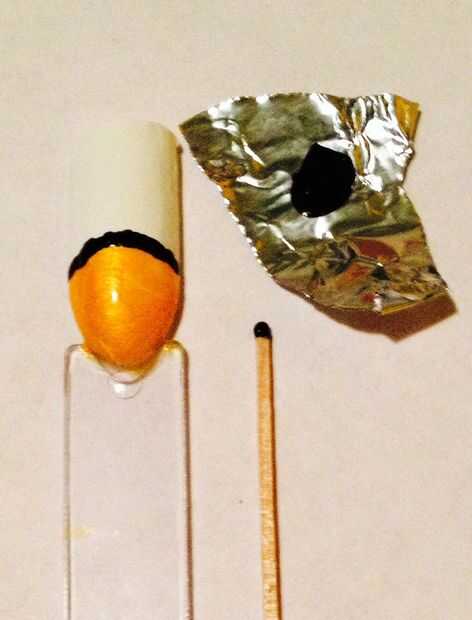 Ahora utilizar papel de aluminio y coloque una pequeña cantidad de esmalte de uñas negro en él. Entonces uso del diente que escoger para hacer una línea entonces la tienen medio círculo naranja