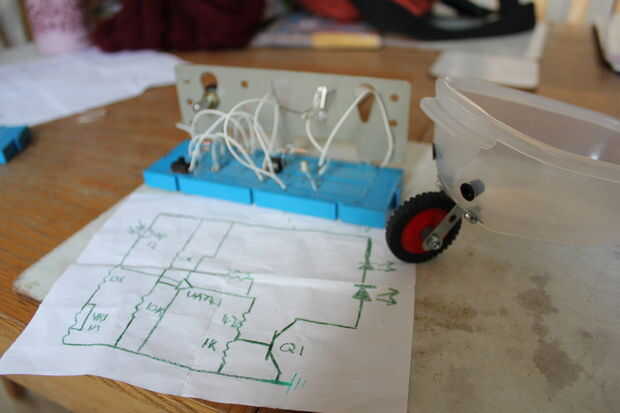 edificio el robotEste robot fue diseñado como un proyecto para los alumnos de la escuela secundaria construir en un día de actividad. El chasis se proporcionó a lo alumnos pre corte. El costo total de los componentes por robot era GBP5 incluyendo l